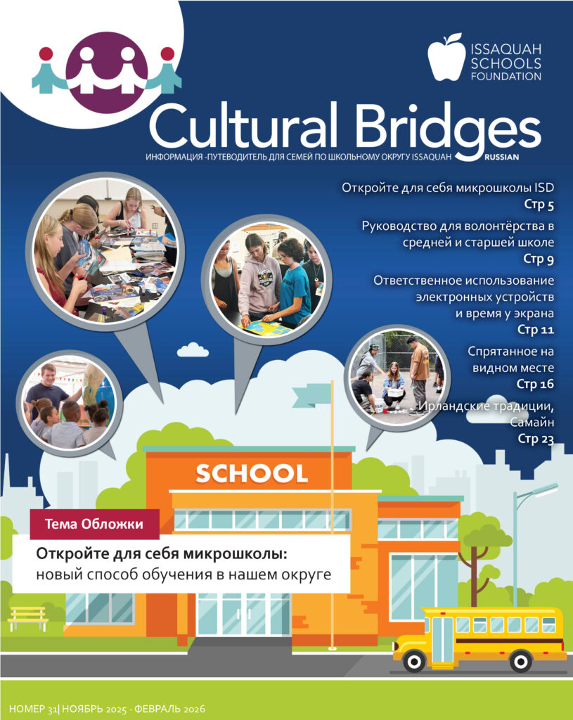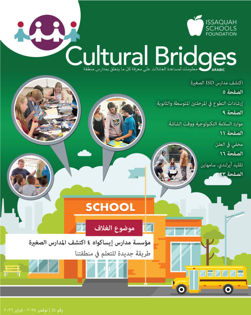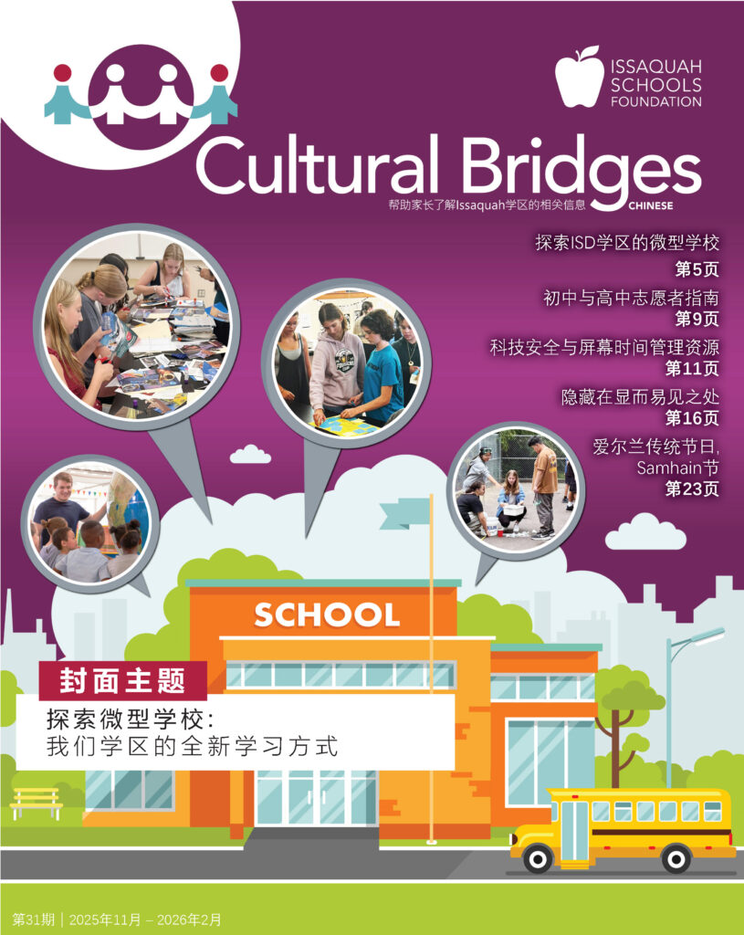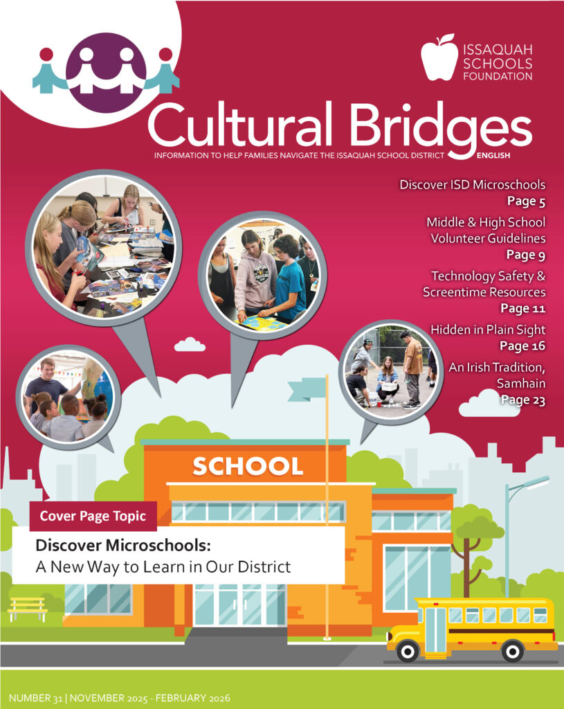 I hope your family is enjoying the new school year! The Cultural Bridges program will keep offering a variety of information and resources, reaching out to serve all families in the Issaquah School District community. Beginning with this issue, we will adjust our publication dates to November and March. This way, we can ensure the highest quality and broaden our support for more diverse families.
