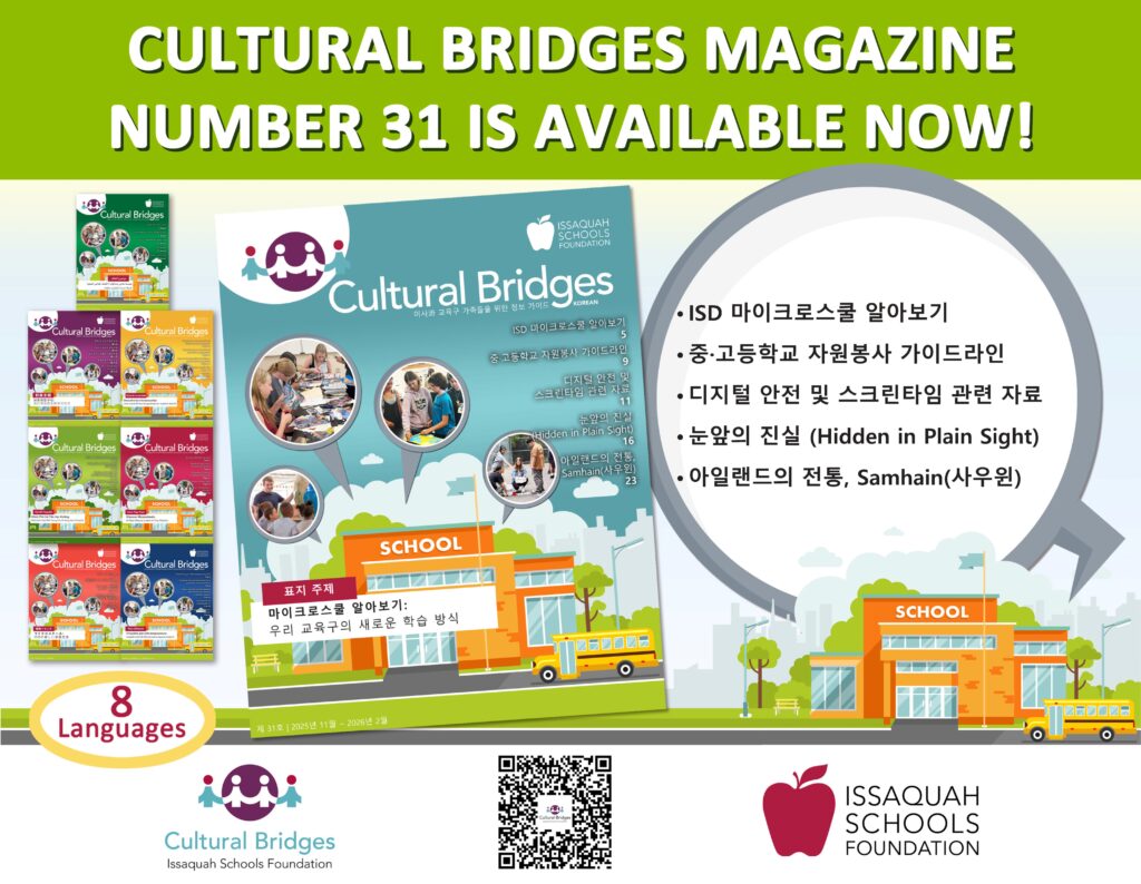 - Cultural Bridges – Number 31Dear Readers, I hope your family is enjoying the new school year! The Cultural Bridges program will keep offering a variety of information and resources, reaching out to serve all families in the Issaquah School District community….